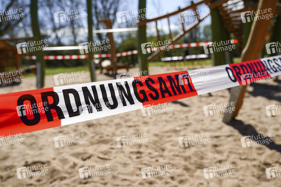 Absperrung, Absperrband, Spielplatz, Kinderspielplatz, Virus, Viren, Corona, Sars-CoV-2, Covid-19, Coronavirus, Coronaviren, Corona-Virus, Corona-Viren, Ansteckung, Ansteckungsgefahr, Epidemie, Pandemie, Infektion, Infektionen, anstecken, Vorbeugung, Prävention, schützen, Schutz, Notstand, Ausgangssperre, Ausgangssperren, Ausgangsbeschränkung, Ausgangsverbot, Notstandsgesetze, Social Distancing, Selbstquarantäne, zu Hause bleiben, Selbstisolation, soziale Kontakte, Risiko, Maßnahmen, Coronamaßnahmen, Corona-Infektion, Corona-Infektionen, Corona-Schutz, menschenleer, #stay home, #stayhome, Symbolfoto, Symbolbild