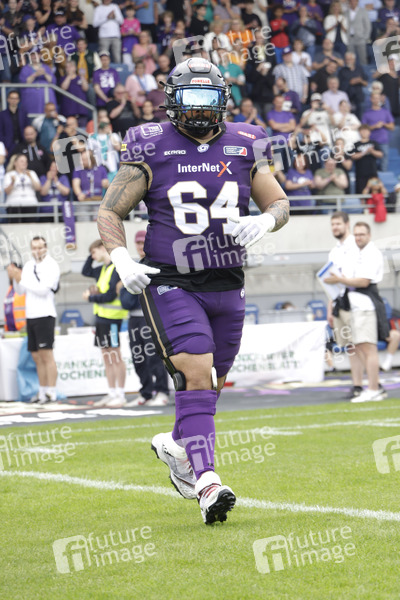 Dimitrios Gkountoudis (Frankfurt Galaxy OL) beim American Football-Spiel Frankfurt Galaxy gegen Hamburg Sea Devils in der PSD Bank Arena. Frankfurt am Main, 30.06.2024