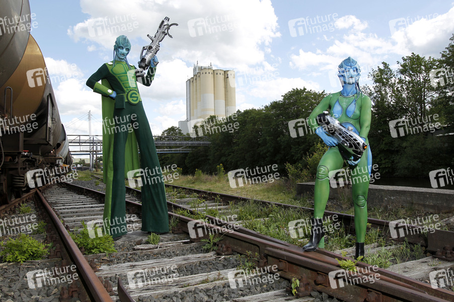 Cosplay, Cosplayer, Bodypainting, Body-Painting, Make-up, Latexappliaktionen, Maskenbildnerei, Körperkunst, Körperfarben, Projekt Farbkörper, Farbe, Bemalung, Kunst, Malerei, Außerirdische, Besucher, Invasion, Science Fiction, nackt, Erkundung, Bahn, Gleise, Bahngleise, Waffe, Waffen, Strahlengewehr, Waggons, Bahnwaggon, Güterbahnhof, body painting, body art, project color body, colors, nude, naked, alien, aliens, tracks, railroad tracks, wagons, railway wagons, freight station, weapon, weapons, ray gun, vistor, visitors