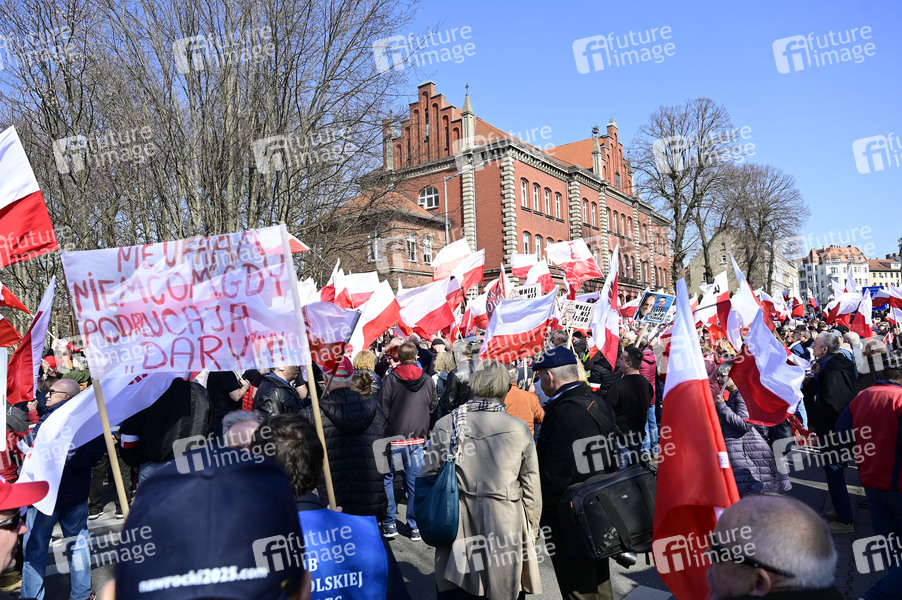 Eine Demo von rechten und nationalen Gruppen aus Polen demonstrieren u.a. gegen die deutsche Asylpolitik am Grenzübergang Görlitz/Zgorzelec - Stadtbrücke, welche aus Sicherheitsgründen mehrere Stunden gesperrt war. Görlitz/Zgorzelec, 22.03.2025
