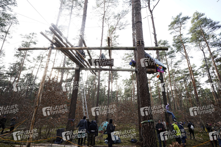 Das Protestcamp von Umweltaktivisten in Grünheide richtet sich gegen die Erweiterungspläne des Tesla-Werks. Die Aktivisten werfen Tesla vor, Umweltverstöße zu begehen, Trinkwasser zu gefährden und Abwasser-Grenzwerten zu überschreiten. Seit Donnerstag halten die Aktivisten einen Teil des Landeswaldes besetzt, den Tesla im Falle einer Erweiterung seines Geländes roden will. Sie haben um die zehn Baumhäuser in mehreren Metern Höhe errichtet und kündigten an, möglichst lange ausharren zu wollen. Auch die Bürgerinitiative Grünheide spricht sich gegen die Erweiterungspläne aus und zeigt sich mit den Besetzern solidarisch. Grünheide, 02.03.2024