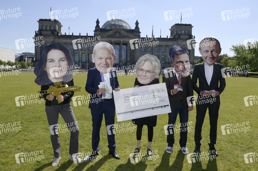 Aktivisten bei einer Protestaktion gegen das sogenannte Sondervermögen von 100 Milliarden für die Bundeswehr vor dem Reichstagsgebäude. Berlin, 03.06.2022