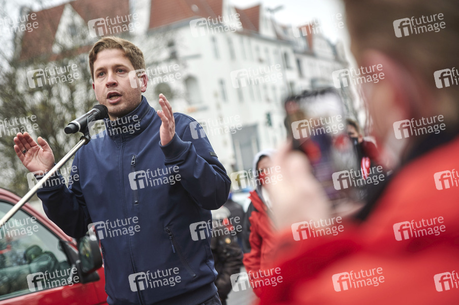 Kevin Kühnert bei der Demonstration von Beschäftigten des Mercedes Benz-Werks in Berlin-Alt-Mariendorf unter dem Motto 'Zukunft oder Widerstand'. Gemeinsam mit der Gewerkschaft IG Metall fordern sie, dass der Stilllegungsbeschluss zumindest teilweise zurückgenommen wird. Berlin, 09.12.2020