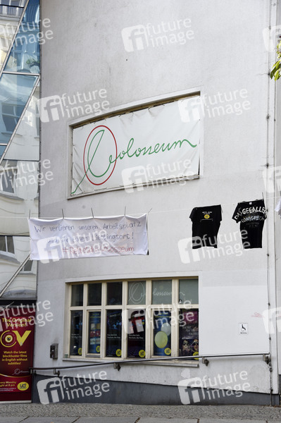 Protestaktion der Mitarbeiter gegen die geplante Schließung des Kinos Colosseum. Mit Aktionen wie dieser wollen die Mitarbeiter und Anwohner die Schließung verhindern. Ihrer Meinung nach wurde das Kino gezielt in den Ruin geführt. Die Betreiberfirma des Kinos hatte am 20. Mai Insolvenz angemeldet, begründet wurde das mit den Folgen der Coronakrise: Kinoverbot, ausbleibende Gäste, keine Einnahmen. Nun zeigt sich, dass wirtschaftliche Gründe infolge der ausbleibenden Einnahmen während der Corona-Krise nicht oder nur teilweise für die Schließung des geschichtsträchtigen Hauses verantwortlich sind. Finanzielle Corona-Unternehmenshilfen wurden nicht beantragt. Vielmehr haben sich Geschäftsführer Sammy Brauner und die Erbengemeinschaft des Nachlasses seines in 2019 verstorbenen Vaters Artur Brauner dazu entschlossen, das denkmalgeschützte Haus künftig nicht mehr als Kino fortzuführen. Vieles deutet darauf hin, dass Geschäftsführer Sammy Brauner und die Erbengemeinschaft Brauner andere, lukrativere Pläne für die Immobilie an dieser zentralen Stelle im Stadtteil Prenzlauer Berg verfolgen. Laut www.gleimviertel.de sei bereits im September 2019 ein Bauvorbescheid für das Grundstück Schönhauser Allee 123 beantragt worden. Inhalt des Bauvorhabens: Neubau und Überbauung des Grundstücks 'Colosseum' mit Büronutzung im Umfang von 15.960 m2 Gewerbefläche. Dieser Antrag sei positiv beschieden worden. Berlin, 21.06.2020