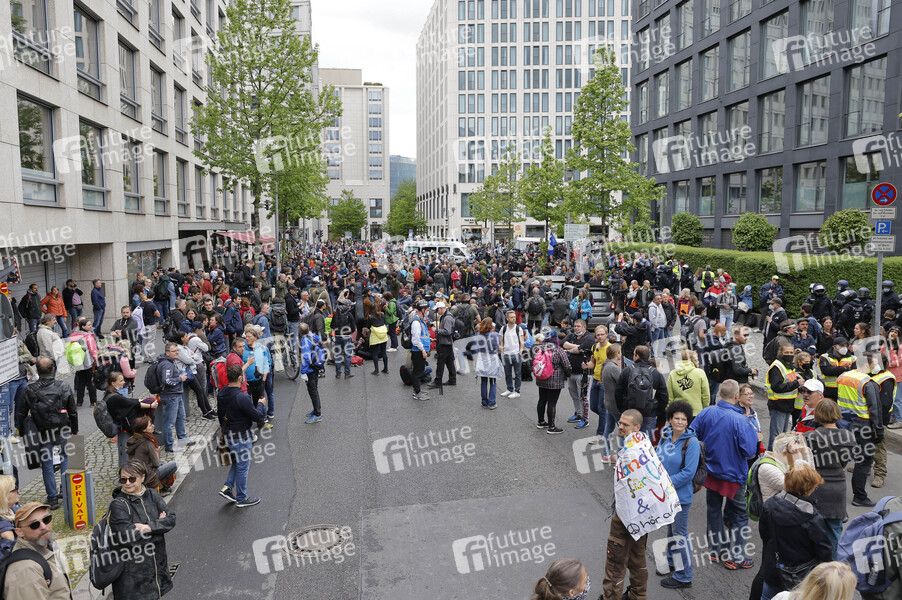 Protest, Demo, Demonstration, Corona-Maßnahmen-Kritiker, Corona-Hygieneregeln, Distanz, Mund-Nasen-Schutz, Protestierende, Demonstranten, Polizei, Polizisten, Polizeieinsatz, Gegner der Corona-Maßnahmen, Infektionsschutzgesetz, Corona-Notbremse, Eindämmung der dritten Pandemiewelle, Coronaleugner, Teilnehmer, Corona-Regeln, Pandemie, Corona-Demo, Coronademo, Querdenker, Querdenken, Gegendemonstranten, Corona-Leugner, Demo gegen Lockdown, Coronasdemo, Corona-Demo