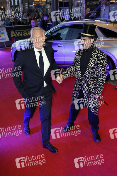 Johannes B. Kerner mit Albert de Paris als Charlie Chaplin bei der Verleihung des 25. Radio Regenbogen Award 2025 in der Europa-Park Arena. Rust, 04.04.2025