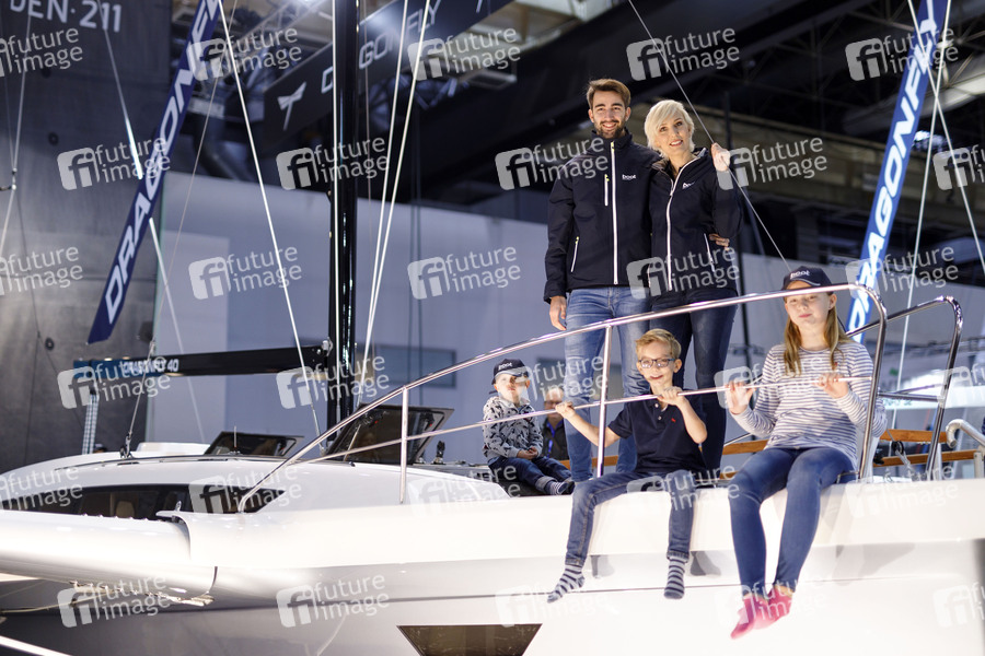 Models posieren auf der Dragonfly 40, einem Trimaran der daenischen Quorning Werft, auf der 51. Boot Düsseldorf - Bootsmesse und Wassersportmesse in der Messe Düsseldorf. Düsseldorf, 19.01.2020