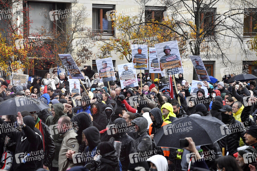 Tausende Demonstranten protestieren am Brandenburger Tor und im Regierungsviertel gegen die Corona-Politik der Regierung. Wegen der massenhaften Verstöße gegen die Hygieneauflagen hat die Polizei die Proteste unter Einsatz von Wasserwerfern beendet. Berlin, 18.11.2020