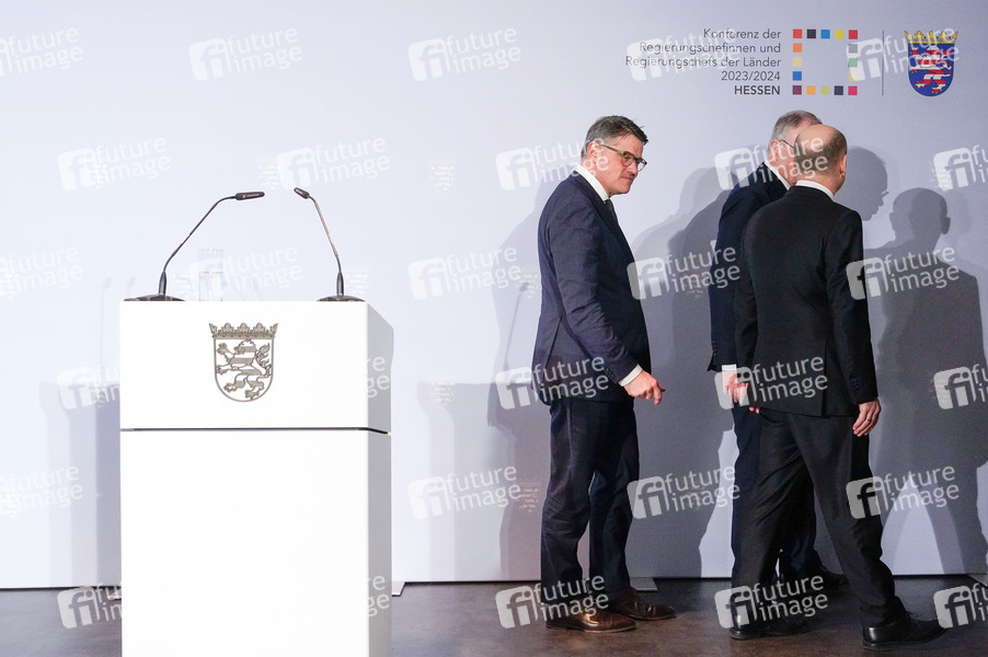 Boris Rhein, Olaf Scholz und Stephan Weil bei der Pressekonferenz zur Ministerpräsidentenkonferenz zur Flüchtlingspolitik von Bund und Ländern in der Vertretung des Landes Hessen beim Bund. Berlin, 06.03.2024