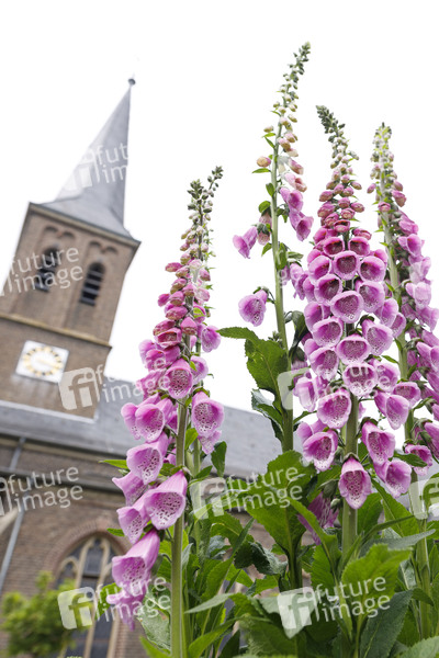 Der Rote Fingerhut (Digitalis purpurea) ist eine Pflanzenart aus der Gattung der Fingerhüte (Digitalis) in der Familie der Wegerichgewächse (Plantaginaceae). Im Bild ein roter Fingerhut an der Kirche in Königsdorf bei Köln. (Themenbild, Symbolbild) Frechen, 04.06.2021