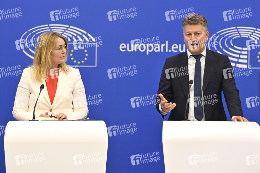 Christel Schaldemose und Andreas Schwab bei der Pressekonferenz zum Ergebnis der Schlussabstimmung des Digital Services Act nd des Digital Markets Act im Europäischen Parlament, Straßburg, 05.07.2022