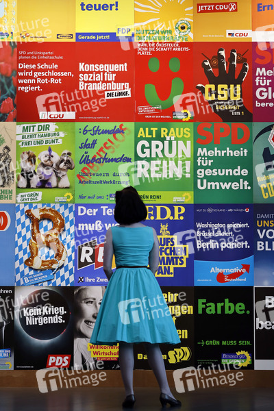 Ausstellung, Wahlen, Bundestagswahl, Landtagswahl, Kommunalwahl, Wahlen 2021, Wahlslogans, Wahlslogan, Wahlplakat, Wahlplakate, Wahlkampf, Wahlversprechen, Politik, Politiker, Wahlwerbung, Wahlen, Wählen, Demokratie, BRD, Bundesrepublik Deutschland, Geschichte, Ästhetik, Kunst, Politiker, Wählerbeeinflussung, Persuasion