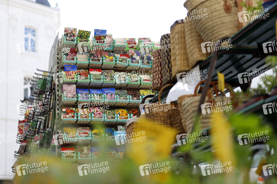 Ein Regal mit Saattüten an einem Floristengeschäft. (Themenbild, Symbolbild) Bonn, 28.04.2021