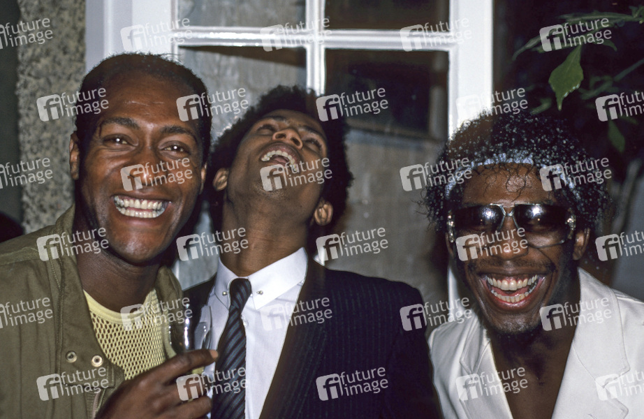 Errol Kennedy, Leee John und Ashley Ingram von Imagination bei der Party zum Release der Thompson Twins LP 'Into the Gap' im Stocks Club. Aldbury, 26.06.1984