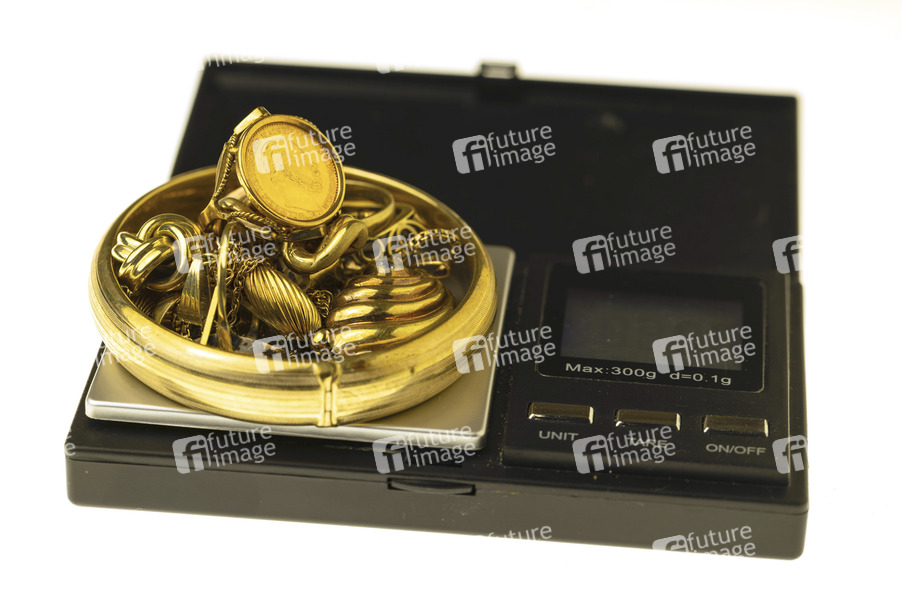 Gold, Barren, Münzen, Goldschmuck, Altgold, Zahngold, Bruchgold, Goldreste, Edelmetall, Feingoldgehalt, Ankaufswert, Ankaufswert, Goldankäufer, Edelmetall-Scheideanstalten, Wertermittlung, Feingehaltstempel, Waage, Goldwaage, Gewicht, Symbolbild, Themenbild