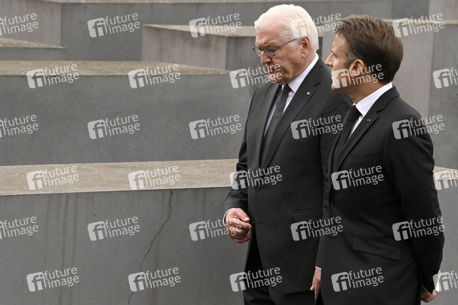 Frank-Walter Steinmeier und Emmanuel Macron bei der Kranzniederlegung am Denkmal für die ermordeten Juden Europas. Berlin, 27.05.2024