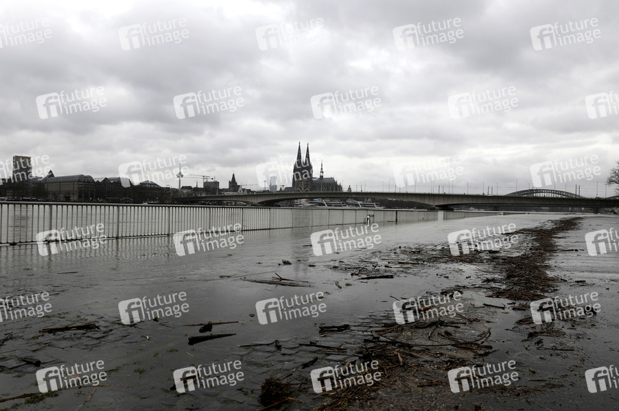 Reinhochwasser, Rheinpegel, Fluss, Rhein, Pegelstand, Pegel, Hochwasser, Pegelmarke, Hochwassermarke, Hochwasserwelle, Scheitelpunkt, Rhein-Pegel, Flussbett, Flut, Schifffahrt, Hochwasserschutz, Wasserstand, Mittelwasser, Tauwetter, Rheinschifffahrt, Rheinufer, Rhein-Ufer, Hochwasserschutzzentrale, Hochwasserwelle, Pegel-Nullpunkt, Hochwasserlage, Hochwassermeldedienst, Hochwasserinformationsdienst, Wasserstände, Pegelstände, Wetterlage, ansteigendes Wasser, steigender Pegel, unter Wasser, überflutet, Rheinufer, Schmelzwasser, Wetter, Scheitelpunkt, kritische Marke, Hochwassermarke, Kölner Dom, Deutz, Symbolbild, Symbolfoto