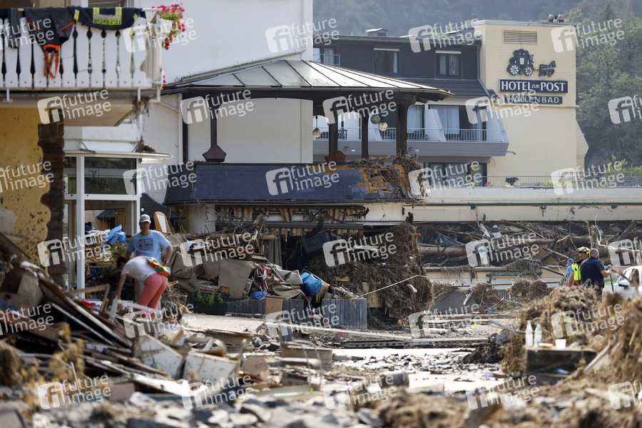 Nach dem Jahrhunderthochwasser in der Eifel durch heftige Regenfälle und Dauerregen mit Überschwemmungen und Überflutungen haben die Aufräumarbeiten im Ahrtal begonnen. Einheiten von Polizei, THW, Bundeswehr und Feuerwehr mitsamt vielen freiwilligen Helfern räumen Straßen, entfernen Schutt und Schlamm und versorgen die Menschen. Im Bild zerstörte Häuser in der Ortschaft Altenahr, in der die Flut viele Häuser zerstörte, 22.07.2021
