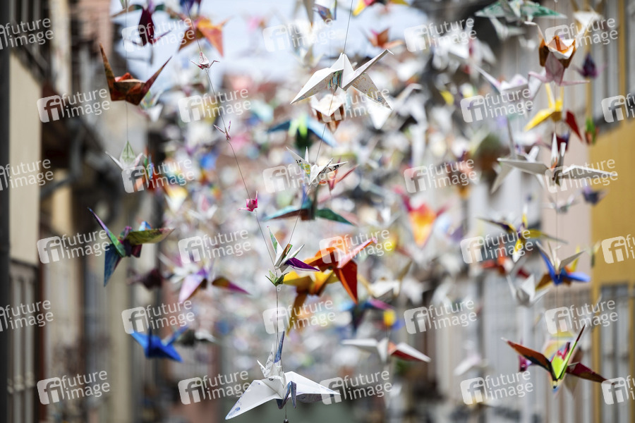 Die Kunstinstallation 1000 Kraniche hängen über der Krämerbrücke bei der Eröffnung vom 47. Krämerbrückenfest. Erfurt, 14.06.2024