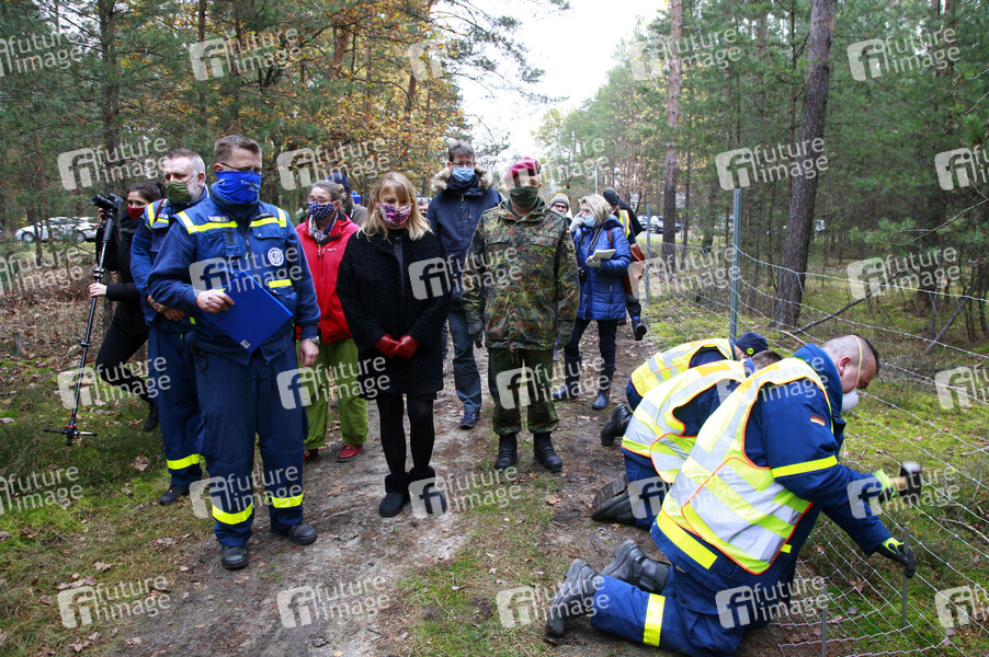 Andreas Heinrich, Petra Köpping und Oberst Klaus Finck beim Pressetermin zum Bau eines festen Zauns an der Restriktionszone zur Eindämmung der Afrikanischen Schweinepest im Truppenlager Werdeck. Krauschwitz, 11.11.2020