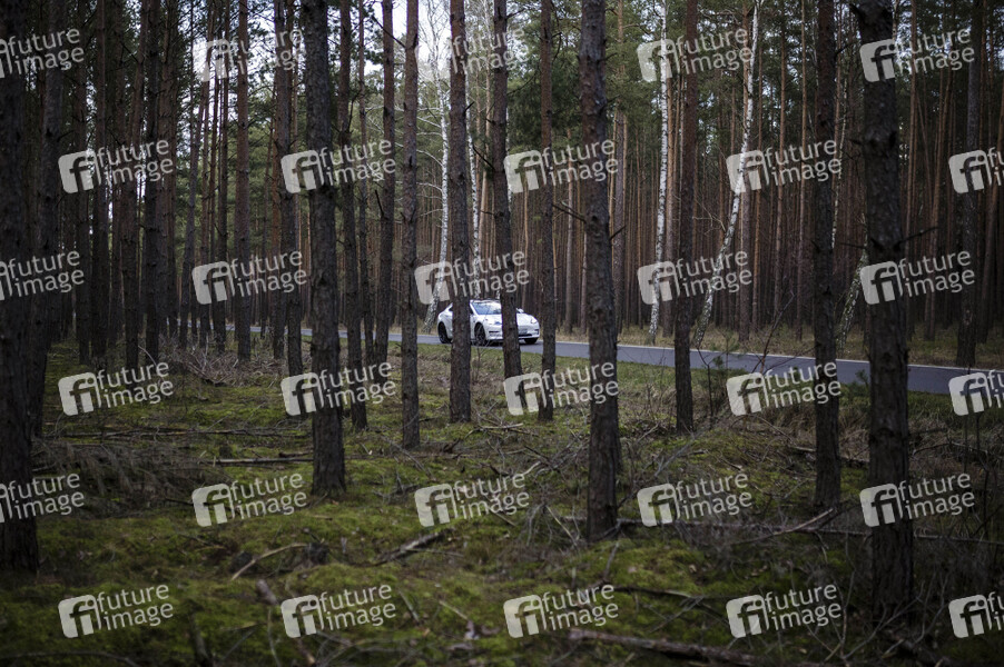 Ein Tesla Model 3 fährt auf einem Waldweg nahe Grünheide. Grünheide, 19.01.2020