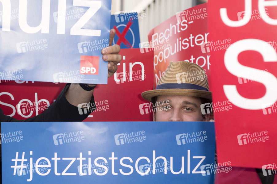 Martin Schulz Unterstützer vor der Telekom Hauptstadtrepräsentanz, in der die TV-Talksendung 'Wie geht´s, Europa?' mit Maybrit Illner und Mitri Sirin stattfindet. Berlin, 22.05.2014