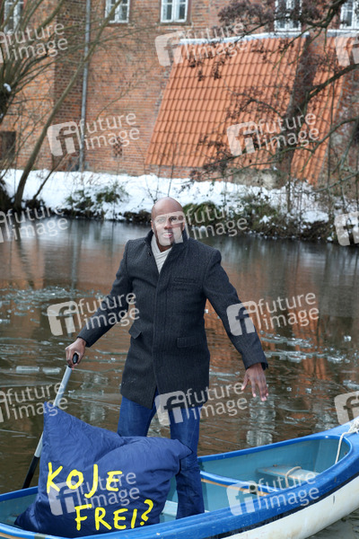 Yared Dibaba paddelt auf dem Schloßteich für die Aktion 'Koje frei?' um für Unterkünfte für Teinehmer der Kirchentags zu werben. Winsen an der Luhe, 13.03.2013