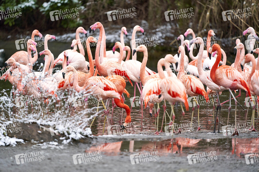 Flamingos bei der Inventur zum Jahresbeginn 2021 im Erlebnis-Zoo Hannover. Hannover, 14.01.2021
