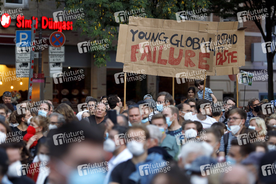 Querdenker stören lautstark und mit Plakaten den Auftritt von Annalena Baerbock bei einer Wahlkampfveranstaltung von Bündnis 90/Die Grünen auf dem Wilhelmplatz. Köln, 02.09.2021