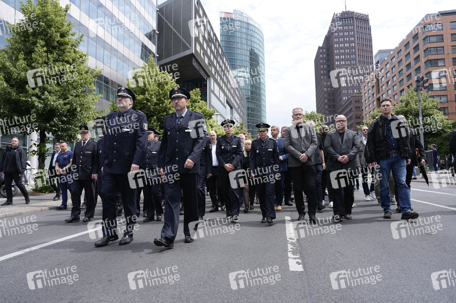 Polizisten in Uniform beim Schweigemarsch für den ermordeten Mannheimer Polizisten Rouven L. vom Potsdamer Platz zur Landesvertretung Baden-Württemberg. Berlin, 07.06.2024