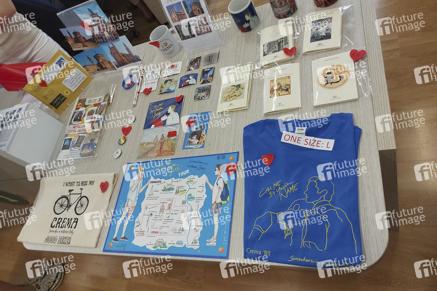 In Crema wurde der Film 'Call Me by Your Name' von Luca Guadagnino zum Großteil gedreht. Im Bild Touristeninformation mit Infos und Originalrequisiten aus dem Film . Crema, 31.07.2024