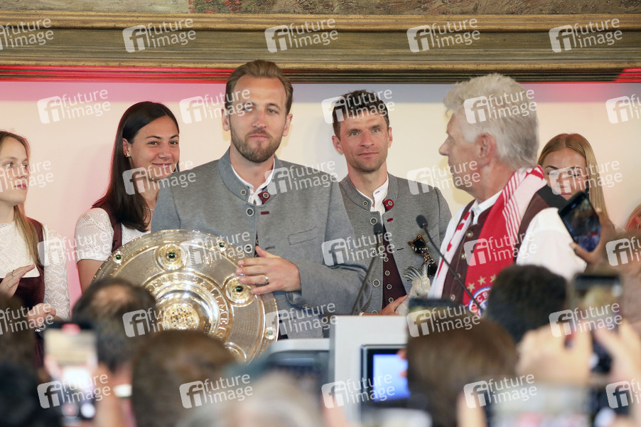 Harry Kane und Dieter Reiter bei der Meisterfeier des FC Bayern München auf dem Balkon des Rathauses am Marienplatz. München, 18.05.2025
