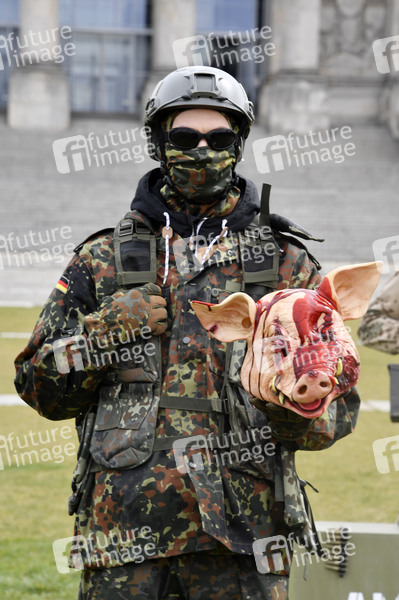 Protestaktion zur Sondersitzung des Verteidigungsausschusses des Bundestags zu den Vorfällen bei den Kommando Spezialkräften (KSK) der Bundeswehr vor dem Reichstagsgebäude. Bei der Aktion führen drei als KSK-Soldaten in voller Tarnmontur gekleidete Aktivisten vor der Kulisse des Bundestagsgebäudes die letzten Skandale der Bundeswehr-Einheit vor: Einer hält einen (künstlichen) blutverschmierten Schweinekopf in Händen, ein anderer zeigt rechtsextreme Symbolik und der dritte trägt Munitionskisten und Munition. Damit sollen die skandalträchtigen 'Partys' einiger KSK-Soldaten (bei denen reale Schweineköpfe verwendet wurden), die rechtsextremen Vorfälle in der Einheit sowie den Munitionsklau symbolisiert werden. Weiterhin wird ein Transparent mit der Aufschrift 'Kommando Spezialkräfte Auflösen' mit dem durchgestrichenen Wappen der Einheit gezeigt. Berlin, 12.04.2021