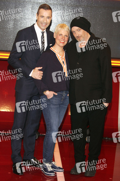 Kai Pflaume, Cordula Stratmann und Torsten Sträter bei der Aufzeichnung der ARD-Quizshow 'Wer weiß denn sowas? XXL' im Studio Hamburg. Hamburg, 11.03.2019
