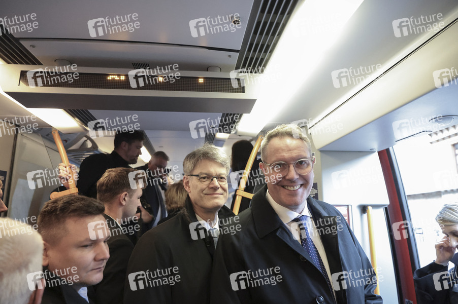 Patrick Schnieder und Alexander Schweitzer bei der Inbetriebnahme der neuen Ahrtalbahn mit Sonderfahrt von Dernau nach Altenahr. Dernau, 12.12.2025