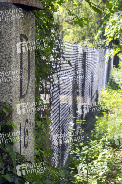 Wegen der Ausbreitung des Corona-Virus haben die Schweiz und Deutschland ihre Grenzen geschlossen. Alter Hintergarten-Grenzzaun mit Grenzstein D16C. Konstanz, 09.05.2020