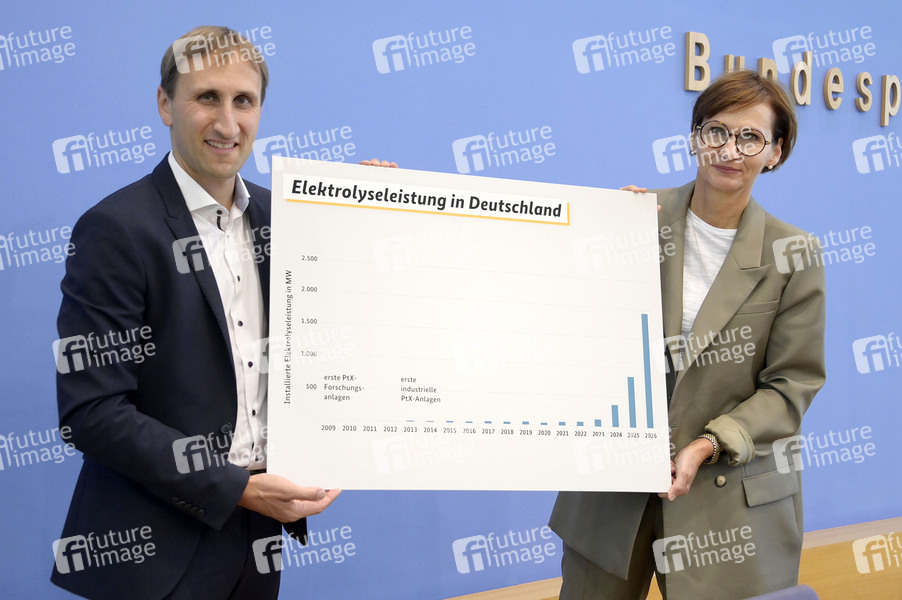 Michael Sterner und Bettina Stark-Watzinger bei der Bundespressekonferenz zur Vorstellung des Wasserstoffatlas Deutschland im Haus der Bundespressekonferenz. Berlin, 21.07.2022