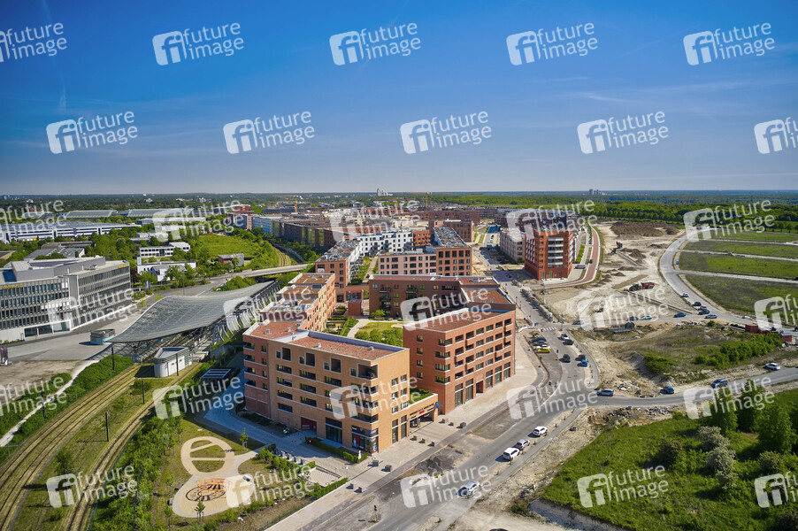 Bau, Baustelle, Wohnegebiet, Bebauung, Interessengemeinschaft Kronsrode Mitte, sechs Wohnungsbauunternehmen, Wphnungen, Reihenhäuser, Gewerbeflächen, Wohnungsbauprojekt, Luftaufnahme, Luftbild, Drohne, Drohnenaufnahme, Rosalind-Franklin-Allee