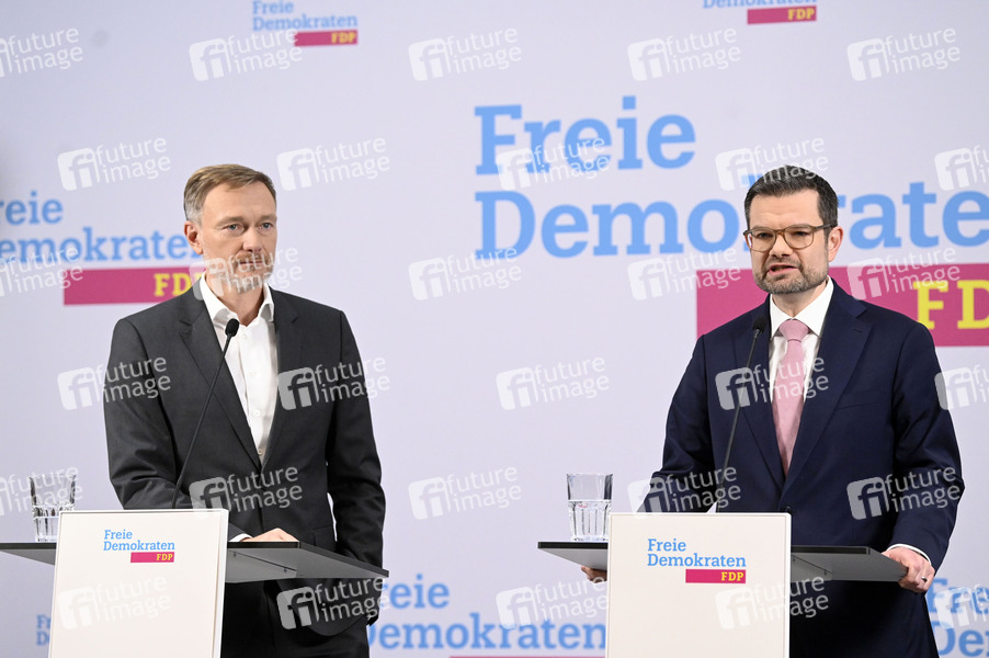 Christian Lindner und Marco Buschmann bei der Presseskonferenz der FDP zur Vorstellung des neuen Generalsekretärs Marco Buschmann im Hans-Dietrich-Genscher-Haus. Berlin, 02.12.2024
