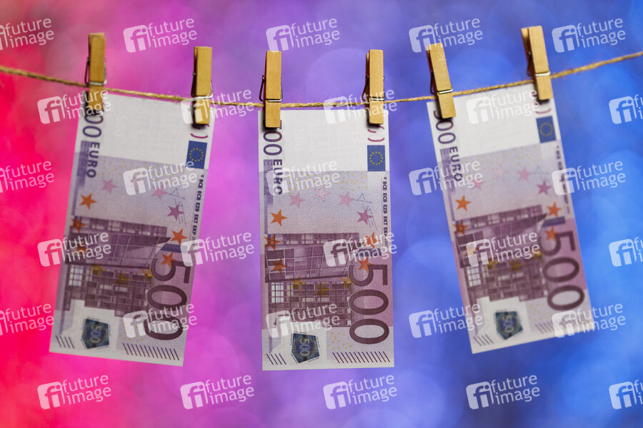 500-Euro-Scheine auf einer Wäscheleine. Köln, 15.01.2020