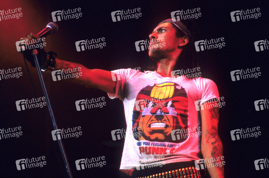 Mark 'Zodiac Mindwarp' Manning von Zodiac Mindwarp and the Love Reaction live auf dem Reading Rock Festival 1986 an der Richfield Avenue. Reading, 24..08.1986
