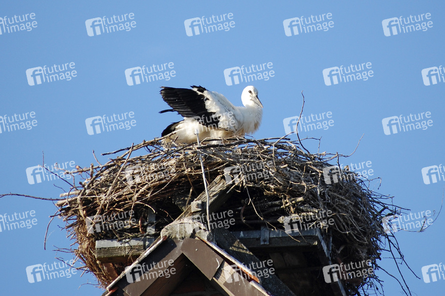 Junger Storch putzt sich in seinem Nest auf einem Dach in Neustadt am Rübenberge, Ortsteil Mecklenhorst