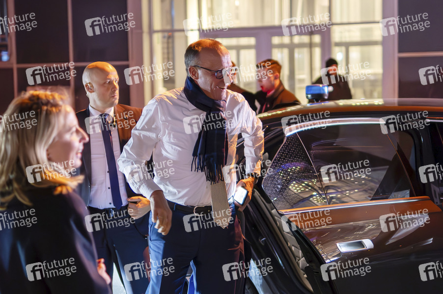 Friedrich Merz bei der Ankunft zur TV Diskussion 'Quadrell - Der große Wahlabend ' zum Bundestagswahlkampf 2025 am Studio Adlershof. Berlin, 16.02.2025