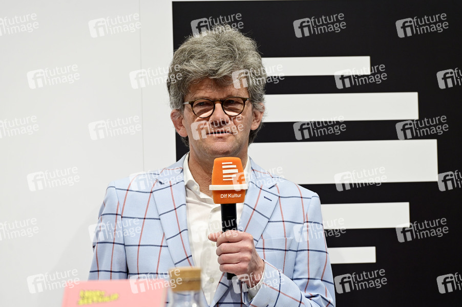 Marcus Weimer von Rattelschneck beim Gespräch zum Buch 'Trotteln' am Messestand von Deutschlandfunk / Deutschlandradio in Halle 2 auf der Leipziger Buchmesse 2025 auf dem Messegelände. Leipzig, 28.03.2025