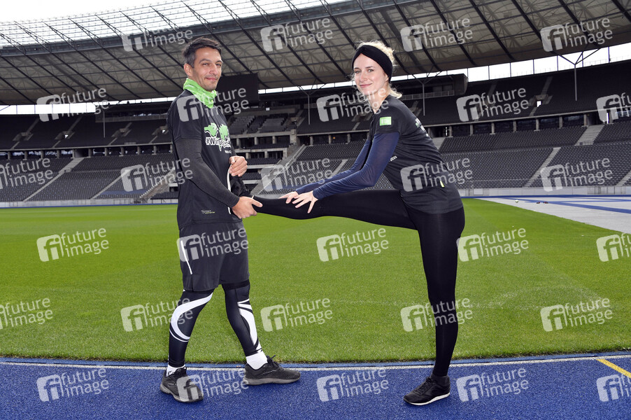 Max Hemmersdorfer und Pia M. Barucki beim Fototermin zur sportichen '#WocheChallenge' im Olympiastation Berlin. Unter dem Motto 'Wir können was bewegen!' ruft die Welthungerhilfe zu dieser Challenge auf und bittet um Spenden für eine Welt ohne Hunger. Berlin, 09.10.2020