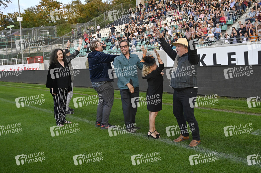 Mechthild Großmann, Claus Dieter Clausnitzer, Björn Meyer, Jan Josef Liefers, ChrisTine Urspruch und Axel Prahl bei der Premiere des ARD-Krimis 'Tatort - Ein Freund, ein guter Freund' zum 20 jährigen Jubiläum des Münsteraner Tatorts im Preußenstadion. Münster, 30.08.2022