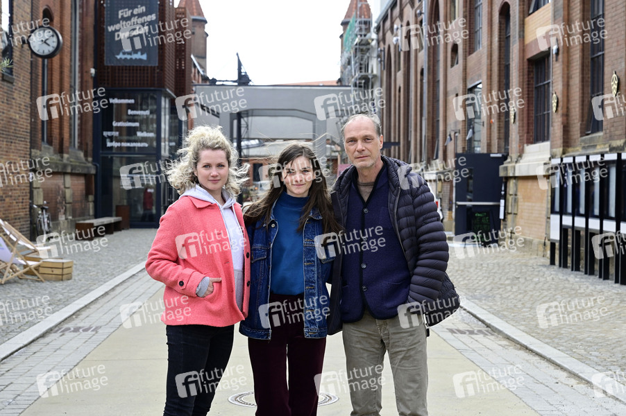 Cornelia Gröschel, Emilie Neumeister und Martin Brambach beim Fototermin am Set des ARD-Krimis 'Tatort: Schwesternliebe' im Dresdner Kraftwerk Mitte. Dresden, 25.04.2024