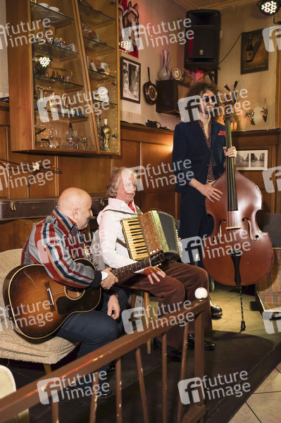 Sandro Giampietro, Helge Schneider und Leo Richartz bei der Pressekonferenz zur neuen Tournee 'Ellebogen vom Tich' in der Kult-Kneipe Weißer Holunder. Köln, 18.11.2025
