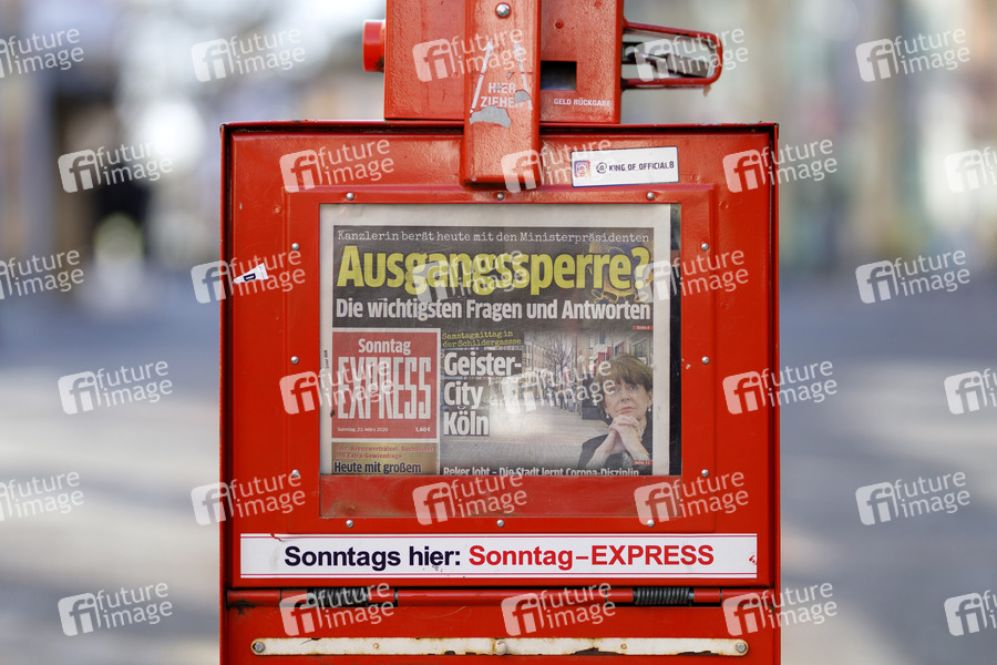 Die menschenleere Schildergasse mit Schlagzeile der Kölner Boulevardzeitung 'Kölner Express' zu einer möglichen Ausgangssperre während der Corona-Krise. Köln, 22.03.2020