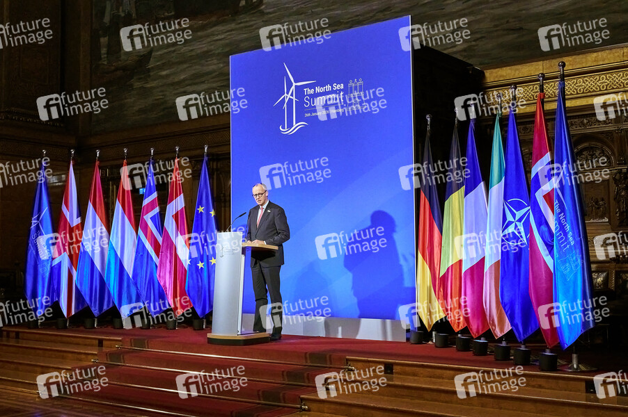 Friedrich Merz beim Treffen der Regierungschefinnen und -chefs sowie der Energieministerinnen und Energieminister zum 3. internationalen Nordsee-Gipfel 2026 im Rathaus. Ziel des Gipfels ist es, den grenzüberschreitenden Ausbau der Offshore-Windenergie, den Wasserstoffmarkt und zugleich eine leistungsfähige und vernetzte Offshore-Infrastruktur im gesamten Nordseeraum weiter voranzutreiben. Hamburg, 26.01.2026